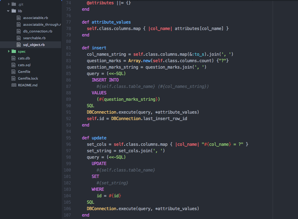 ORM inspired by the functionality of Rails's Active Record, in Ruby and SQL. Utilizes Ruby's metaprogramming capabilities to replicate the CRUD functions of Active Record Models, as well as its most common association methods. Github
